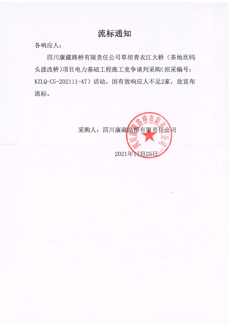 四川康藏路橋有限責任公司草壩青衣江大橋(茶地坎碼頭渡改橋)項目電力基礎(chǔ)工程施工競爭談判采購流標通知