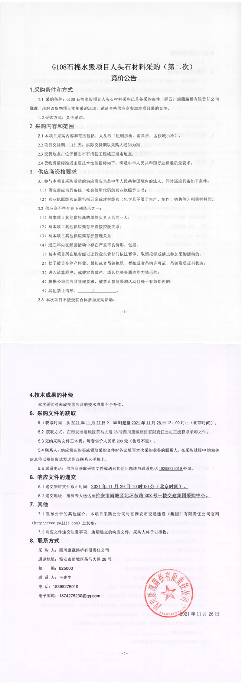 四川康藏路橋有限責(zé)任公司G108石棉水毀項(xiàng)目人頭石材料采購(第二次)競價公告