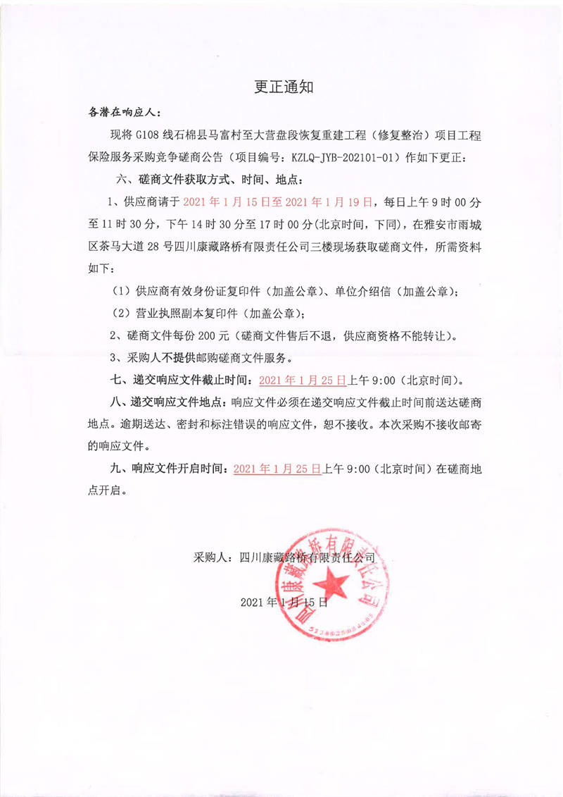 四川康藏路橋有限責任公司G108線石棉縣馬富村至大營盤段恢復重建工程(修復整治)項目工程保險服務采購更正通知