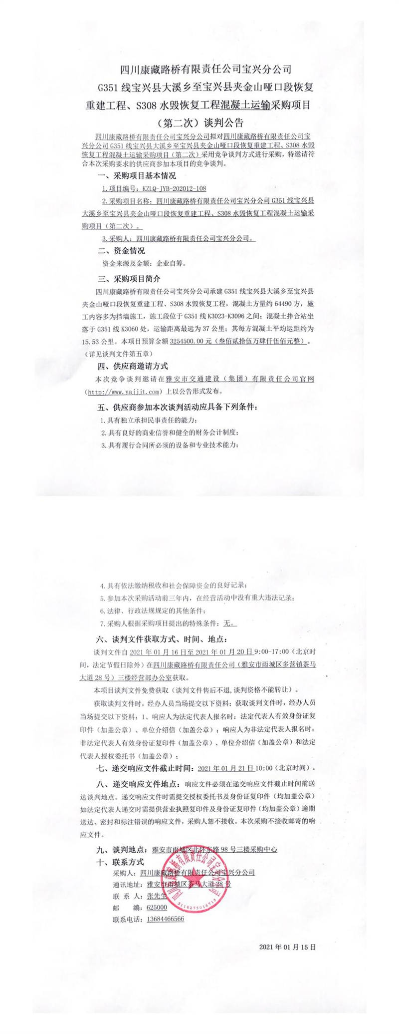 四川康藏路橋有限責(zé)任公司寶興分公司G351線寶興縣大溪鄉(xiāng)至寶興縣夾金山啞口段恢復(fù)重建工程、S308水毀恢復(fù)工程混凝土運輸采購項目(第二次)談判公告