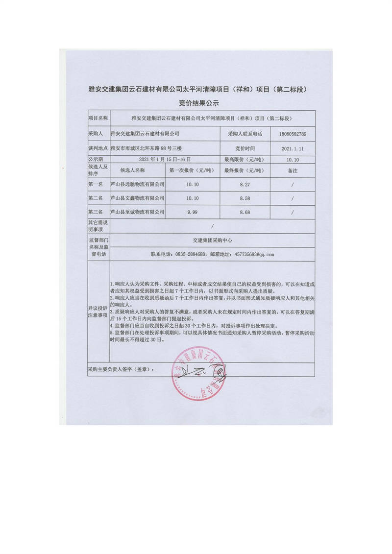 雅安交建集團(tuán)云石建材有限公司太平河清障項(xiàng)目(王河壩)項(xiàng)目(第一標(biāo)段)競價結(jié)果公示