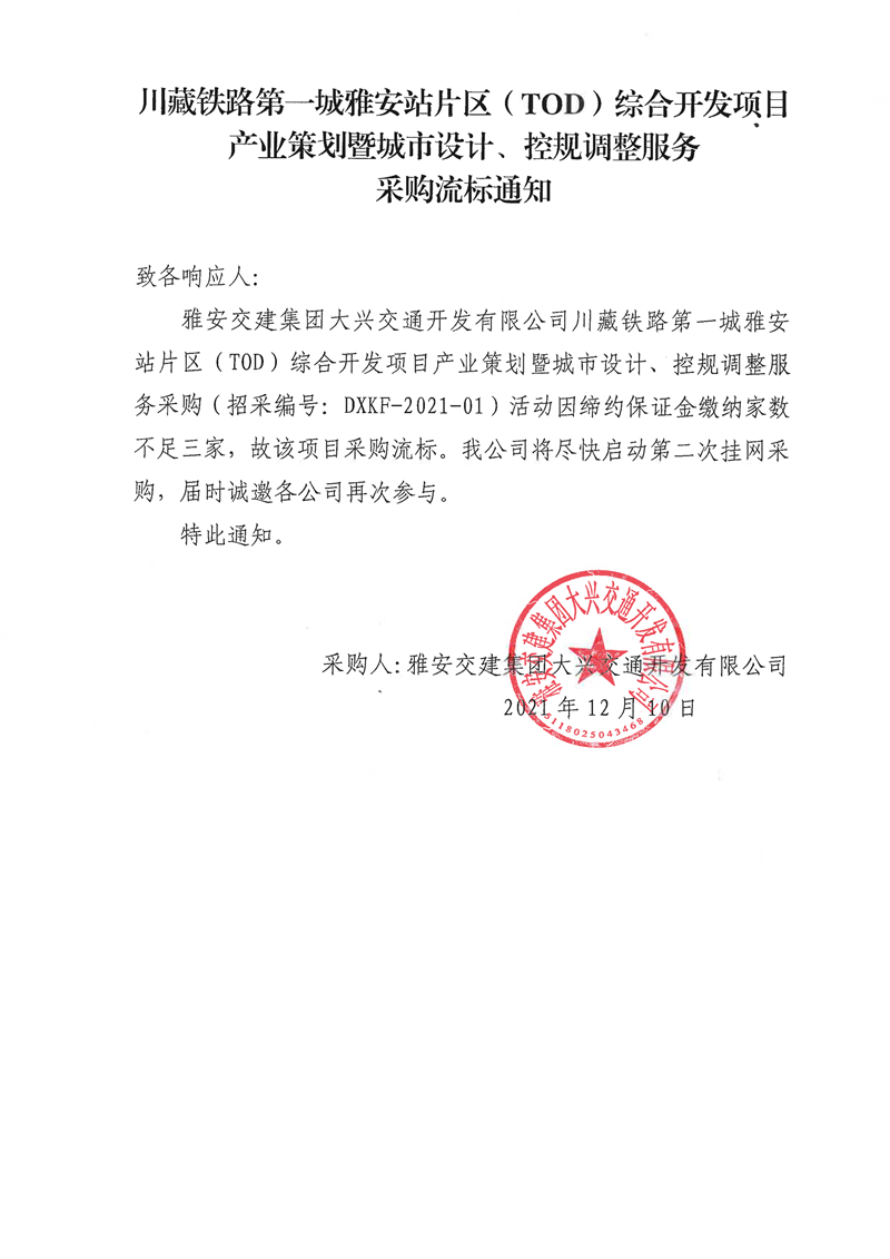 雅安交建集團大興交通開發(fā)有限公司川藏鐵路第一城雅安站片區(qū)(TOD)綜合開發(fā)項目產業(yè)策劃暨城市設計、控規(guī)調整服務采購流標通知