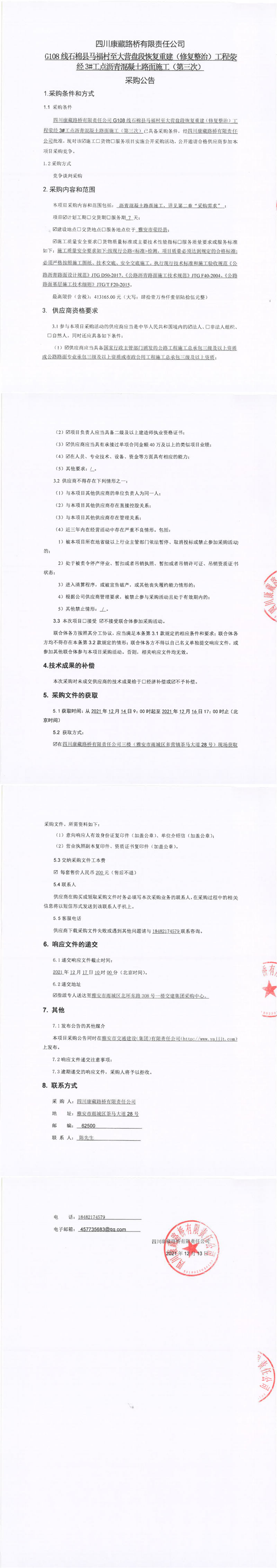 四川康藏路橋有限責任公司G108線石棉縣馬福村至大營盤段恢復重建(修復整治)工程滎經(jīng)3#工點瀝青混凝土路面施工(第三次)采購公告