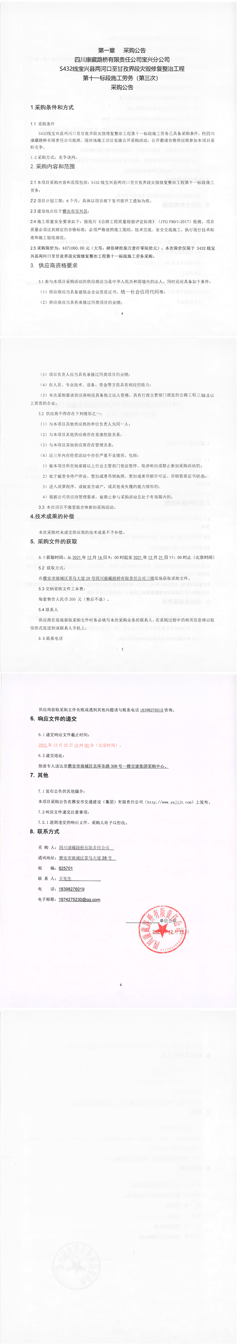 四川康藏路橋有限責任公司S432線寶興縣兩河口至甘孜界段災毀修復整治工程第十二標段施工勞務經(jīng)營高效招采結(jié)果公示
