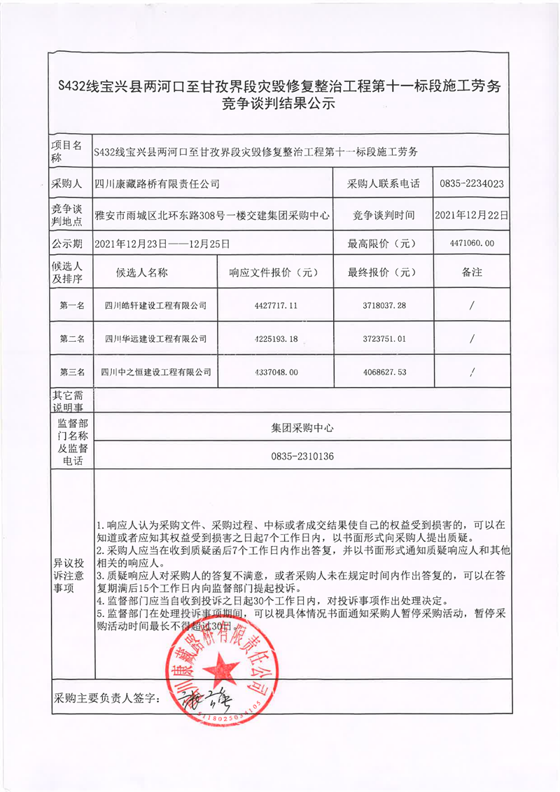 四川康藏路橋有限責(zé)任公司S432線寶興縣兩河口至甘孜界段災(zāi)毀修復(fù)整治工程第十一標(biāo)段施工勞務(wù)競(jìng)爭(zhēng)談判結(jié)果公示