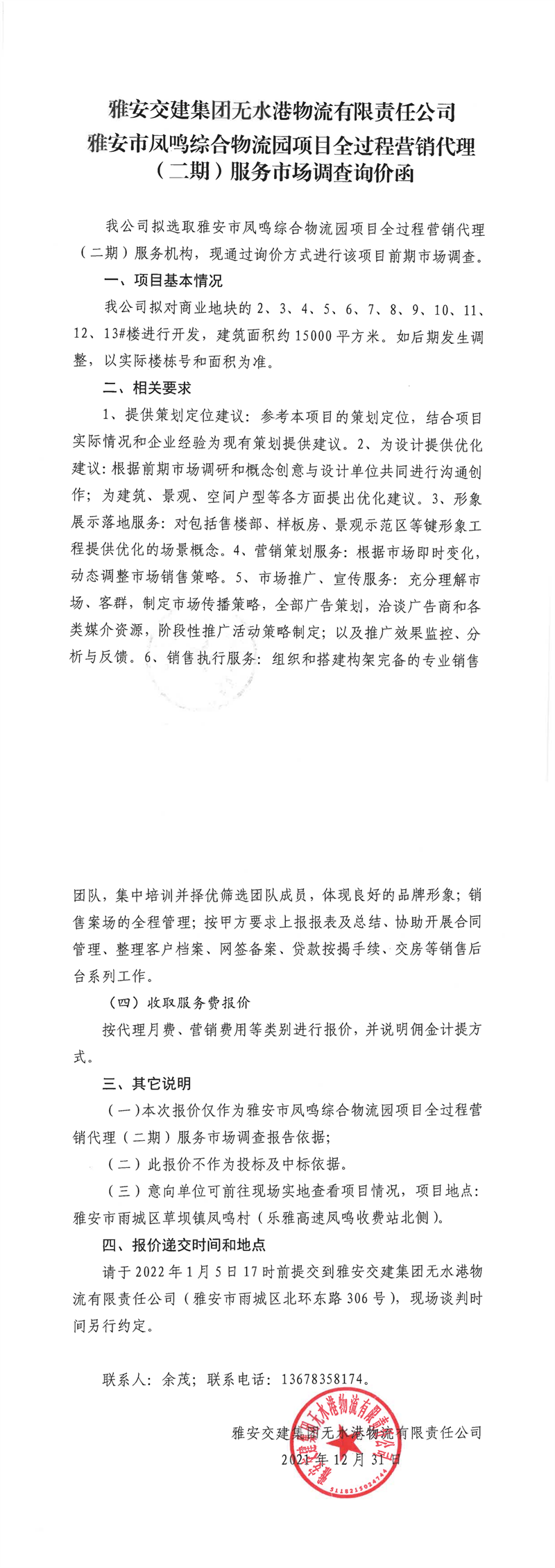 雅安交建集團(tuán)無(wú)水港物流有限責(zé)任公司雅安市鳳鳴綜合物流園項(xiàng)目全過(guò)程營(yíng)銷代理(二期)服務(wù)市場(chǎng)調(diào)查詢價(jià)函