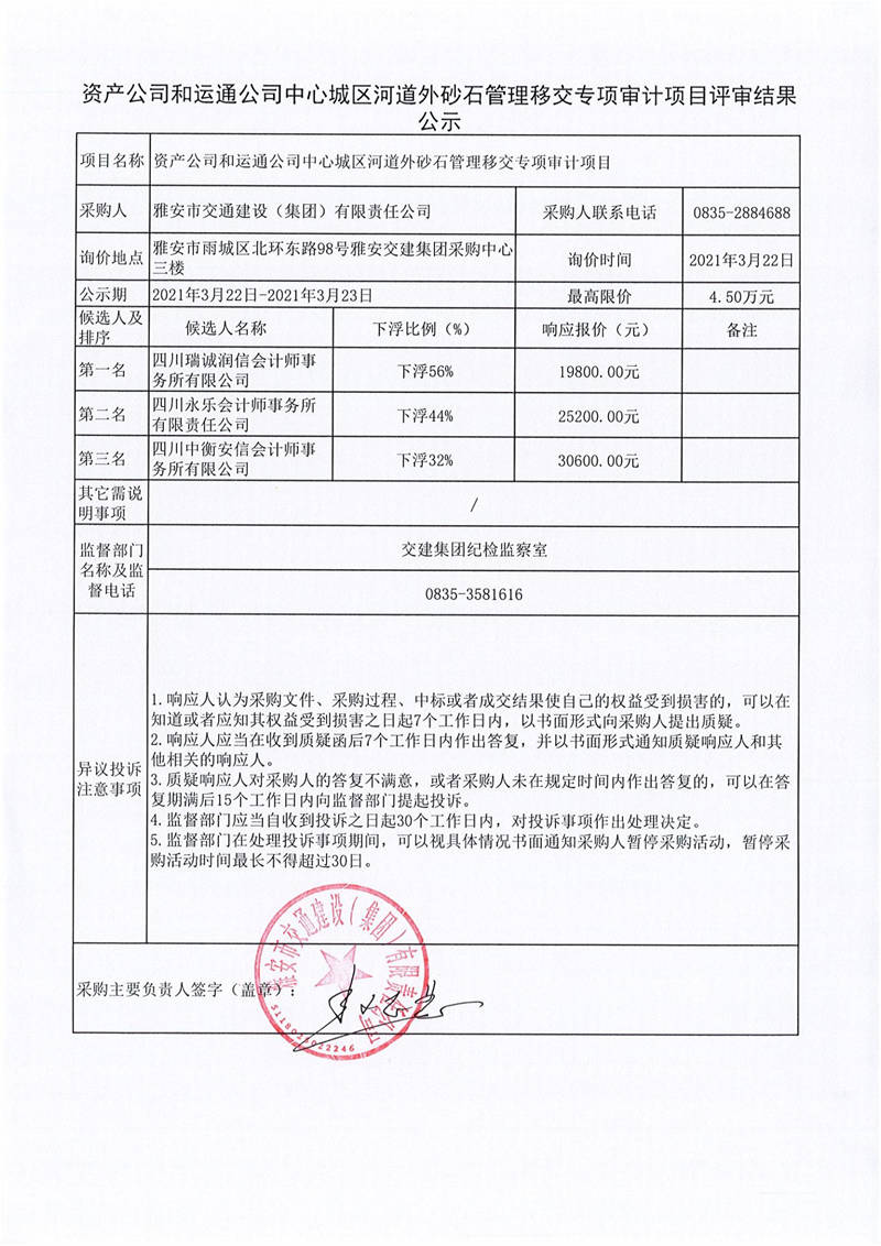 雅安市交通建設(shè)(集團(tuán))有限責(zé)任公司資產(chǎn)公司和運(yùn)通公司中心城區(qū)河道外砂石管理移交專項審計項目評審結(jié)果公示