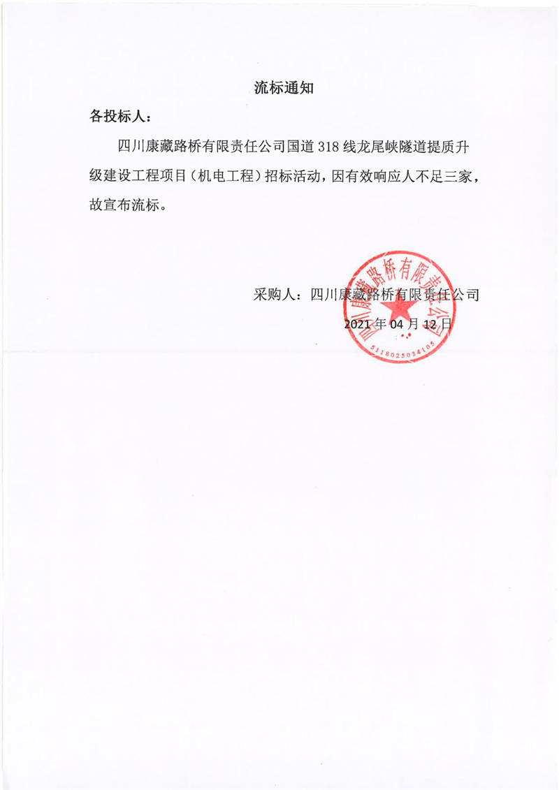 四川康藏路橋有限責(zé)任公司國道318線龍尾峽隧道提質(zhì)升級建設(shè)工程項(xiàng)目(機(jī)電工程)流標(biāo)通知