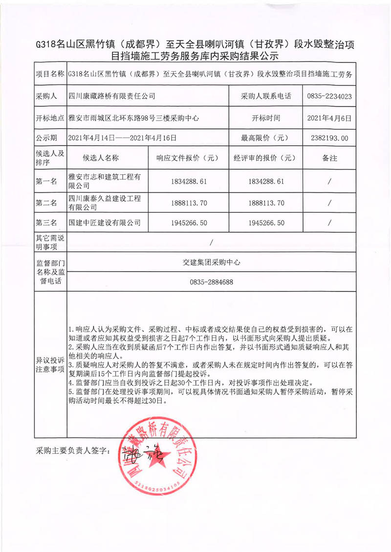 四川康藏路橋有限責(zé)任公司G318名山區(qū)黑竹鎮(zhèn)(成都界)至天全縣喇叭河鎮(zhèn)(甘孜界)段水毀整治項(xiàng)目擋墻施工勞務(wù)服務(wù)庫內(nèi)采購結(jié)果公示