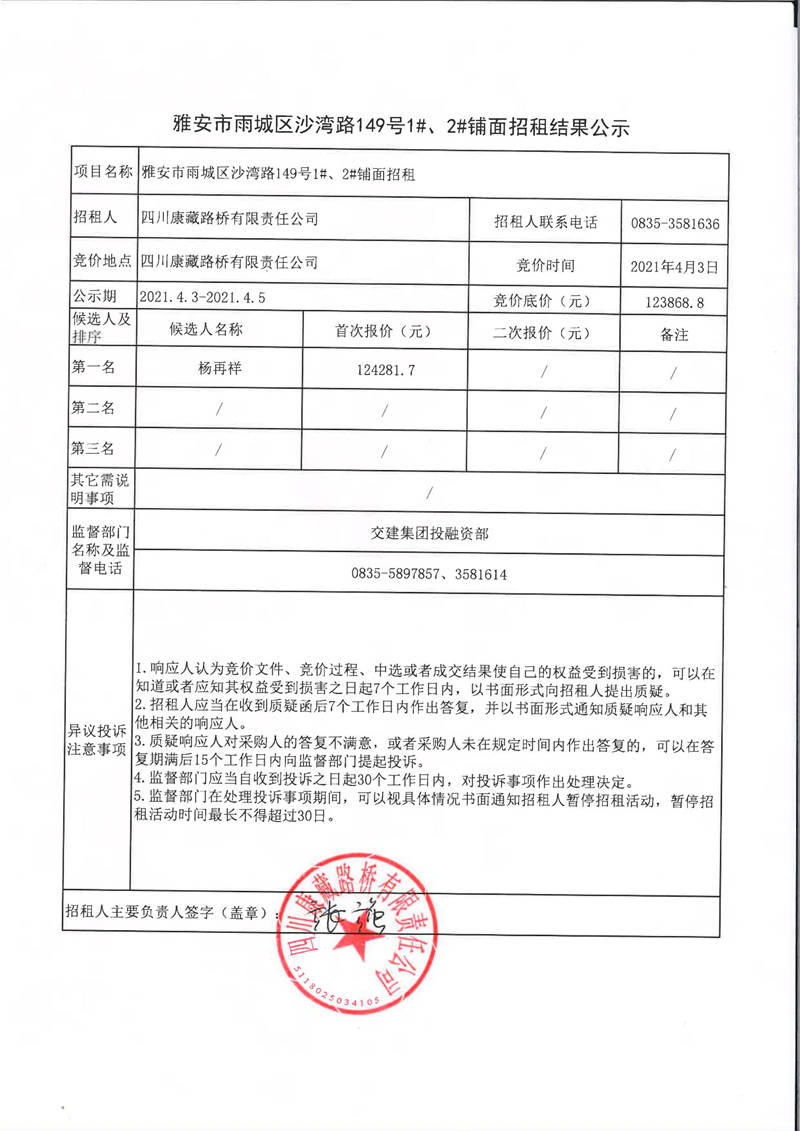 四川康藏路橋有限責任公司雅安市雨城區(qū)沙灣路149號1#、2#鋪面招租結(jié)果公示