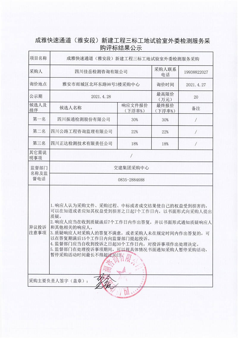 四川佳岳檢測咨詢有限公司成雅快速通道(雅安段)新建工程三標工地試驗室外委檢測服務采購評標結果公示
