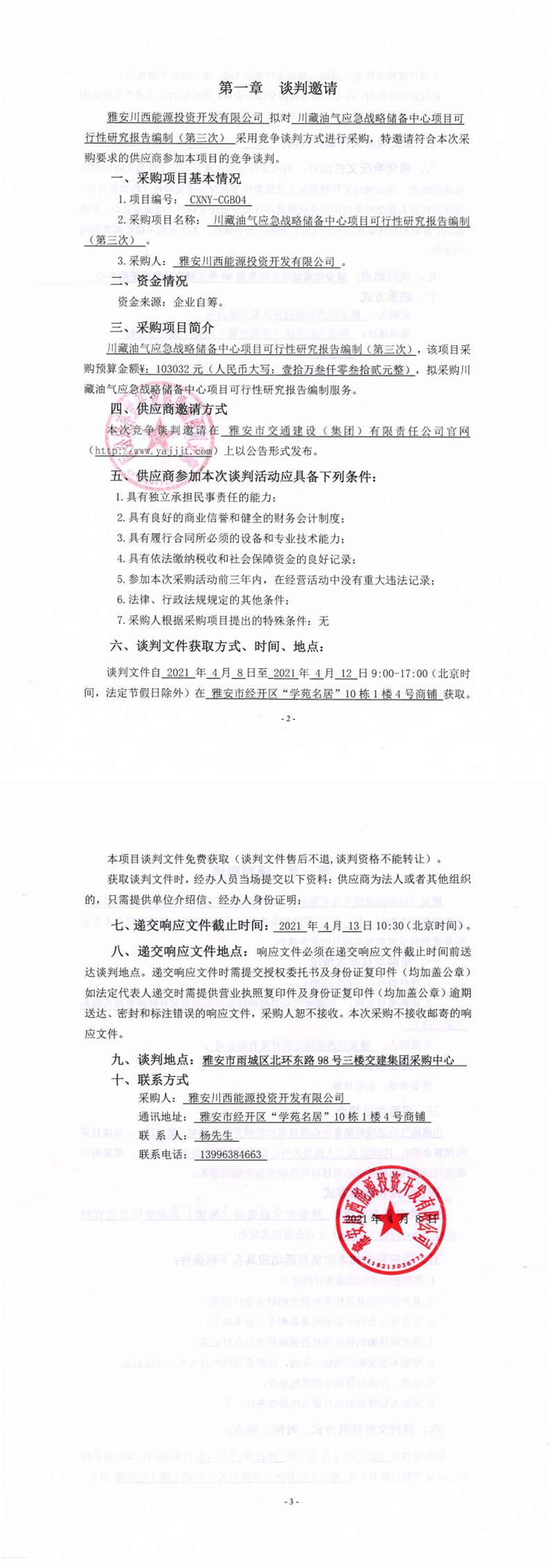 雅安川西能源投資開發(fā)有限公司川藏油氣應急戰(zhàn)略儲備中心項目可行性研究報告編制(第三次)競爭談判公告