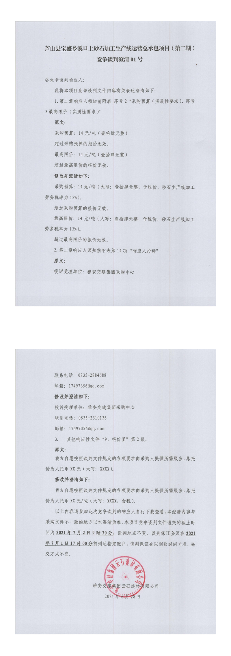 雅安交建集團(tuán)云石建材有限公司蘆山縣寶盛鄉(xiāng)溪口上砂石加工生產(chǎn)線運(yùn)營總承包項(xiàng)目(第二期)競爭談判澄清公告