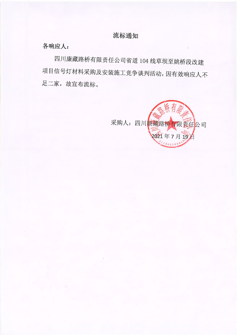 四川康藏路橋有限責(zé)任公司省道104線草壩至姚橋段改建項(xiàng)目信號(hào)燈材料采購(gòu)及安裝施工競(jìng)爭(zhēng)談判流標(biāo)通知
