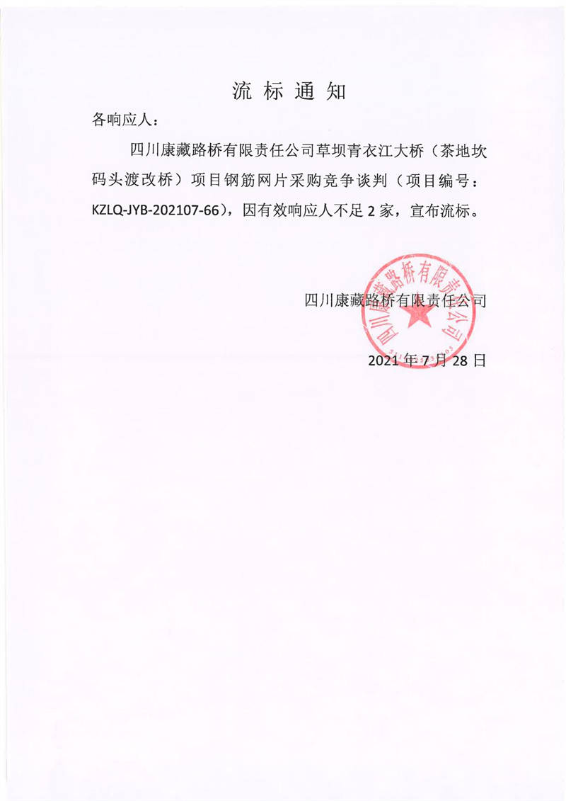 四川康藏路橋有限責(zé)任公司草壩青衣江大橋(茶地坎碼頭渡改橋)項(xiàng)目鋼筋網(wǎng)片采購(gòu)競(jìng)爭(zhēng)談判流標(biāo)通知