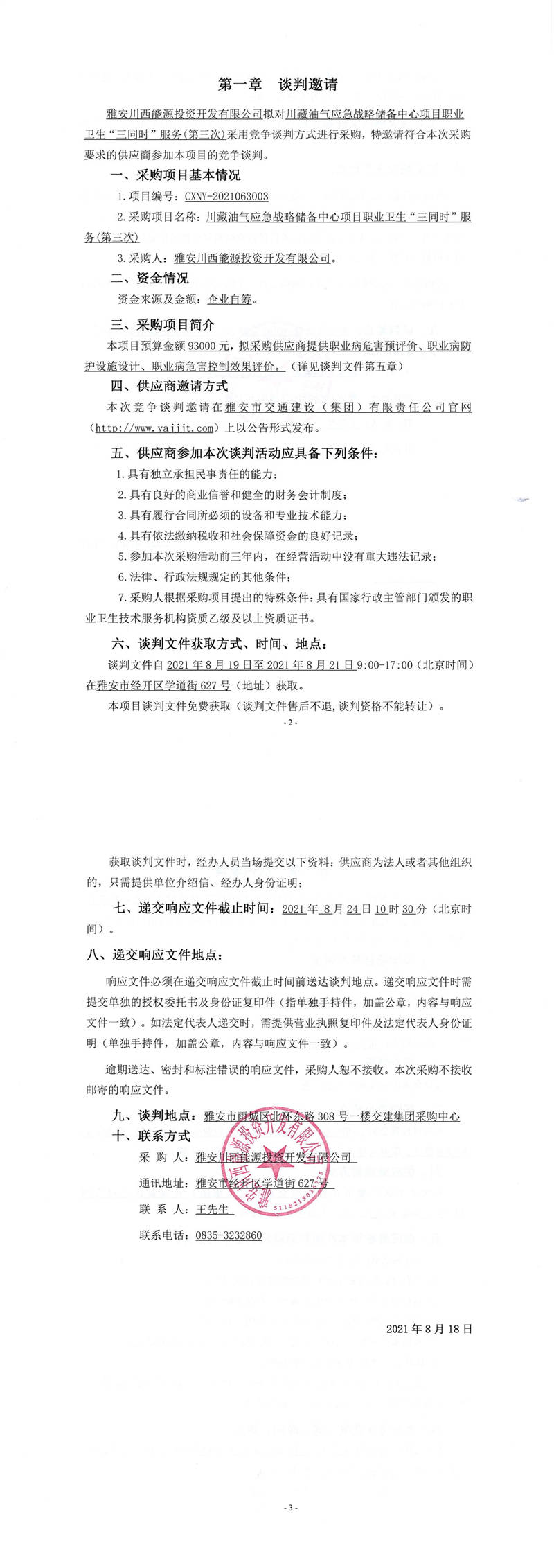 雅安川西能源投資開發(fā)有限公司川藏油氣應(yīng)急戰(zhàn)略儲備中心項目職業(yè)衛(wèi)生“三同時”服務(wù)(第三次)競爭談判
