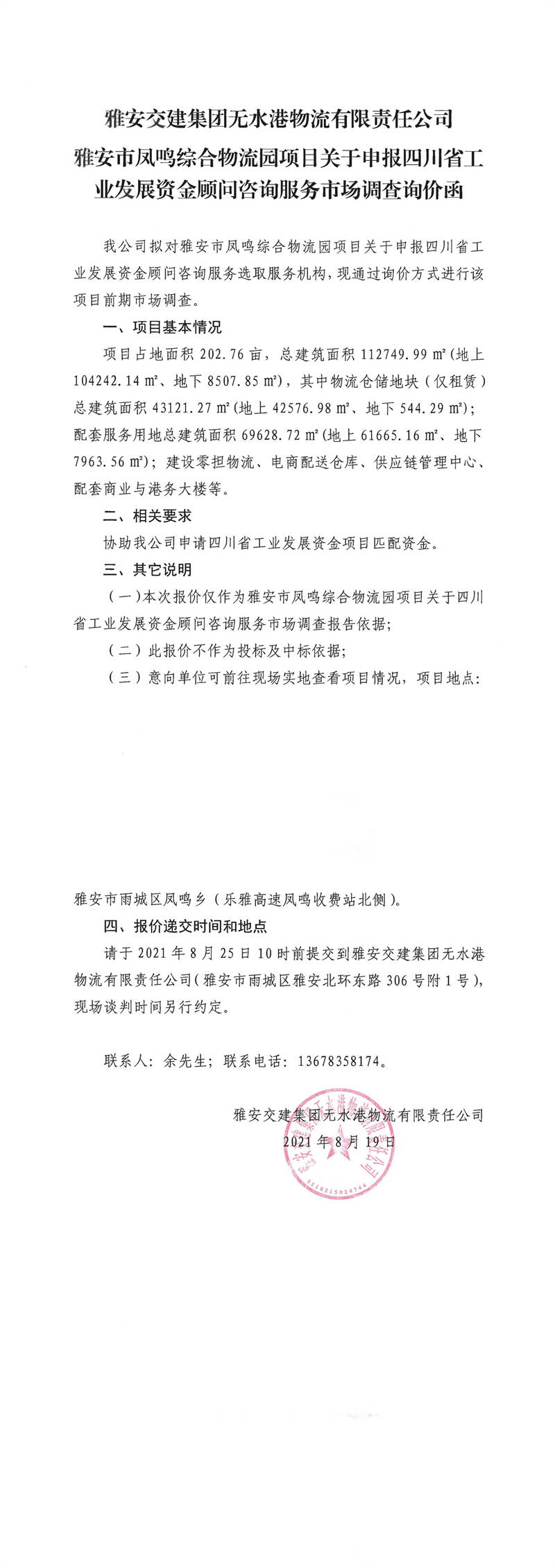 雅安交建集團無水港物流有限責任公司雅安市鳳鳴綜合物流園項目關于申報四川省工業(yè)發(fā)展資金顧問咨詢服務市場調(diào)查詢價函