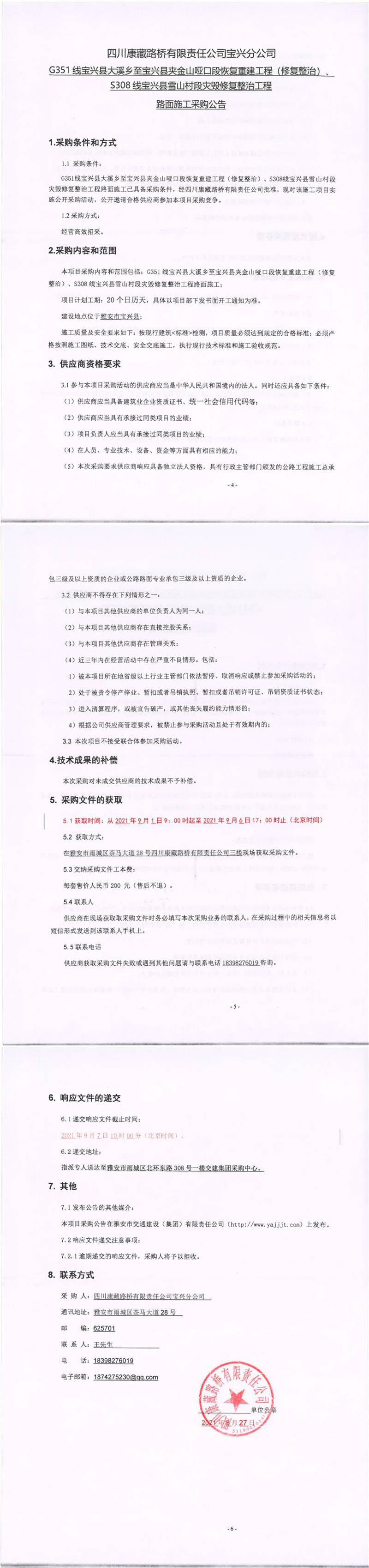 四川康藏路橋有限責(zé)任公司寶興分公司G351線寶興縣大溪鄉(xiāng)至寶興縣夾金山啞口段恢復(fù)重建工程(修復(fù)整治)、S308線寶興縣雪山村段災(zāi)毀修復(fù)整治工程路面施工采購公告