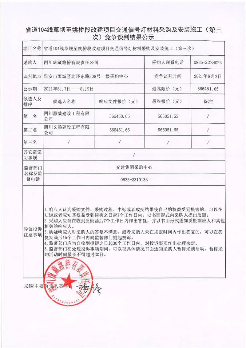 四川康藏路橋有限責(zé)任公司省道104線草壩至姚橋改建項(xiàng)目交通信號(hào)燈材料采購(gòu)及安裝施工(第三次)競(jìng)爭(zhēng)談判結(jié)果公示