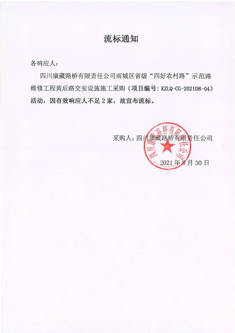 四川康藏路橋有限責(zé)任公司雨城區(qū)省級“四好農(nóng)村路”示范路維修工程黃后路交安設(shè)施施工采購流標(biāo)通知