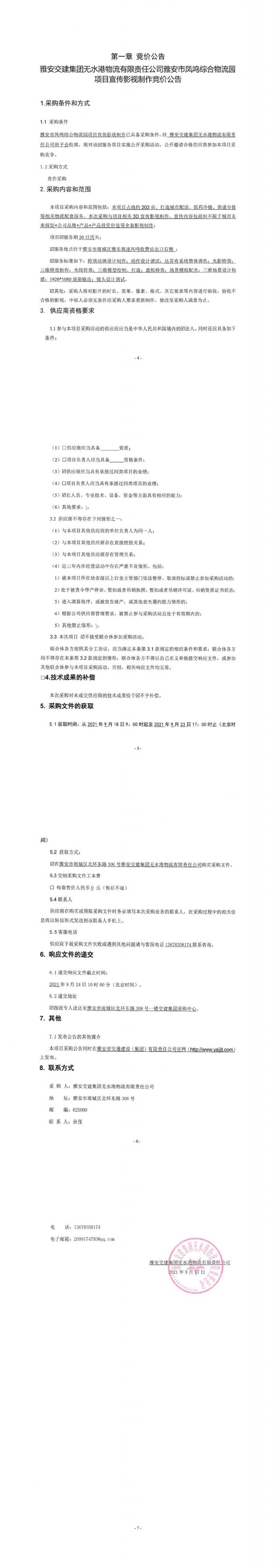 雅安交建集團(tuán)無水港物流有限責(zé)任公司雅安市鳳鳴綜合物流園項(xiàng)目宣傳影視制作競價公告