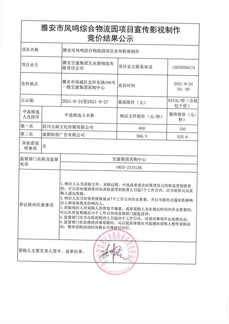 雅安交建集團(tuán)無(wú)水港物流有限責(zé)任公司雅安市鳳鳴綜合物流園項(xiàng)目宣傳影視制作競(jìng)價(jià)結(jié)果公示