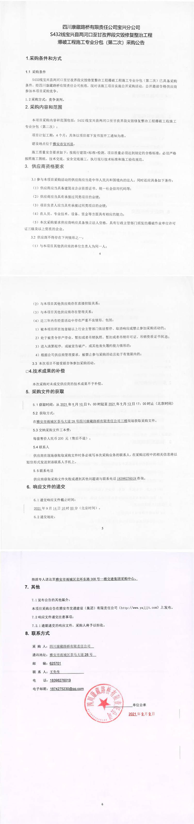 四川康藏路橋有限責(zé)任公司S432線寶興縣兩河口至甘孜界段災(zāi)毀修復(fù)整治工程爆破工程施工專業(yè)分包(第二次)采購(gòu)公告