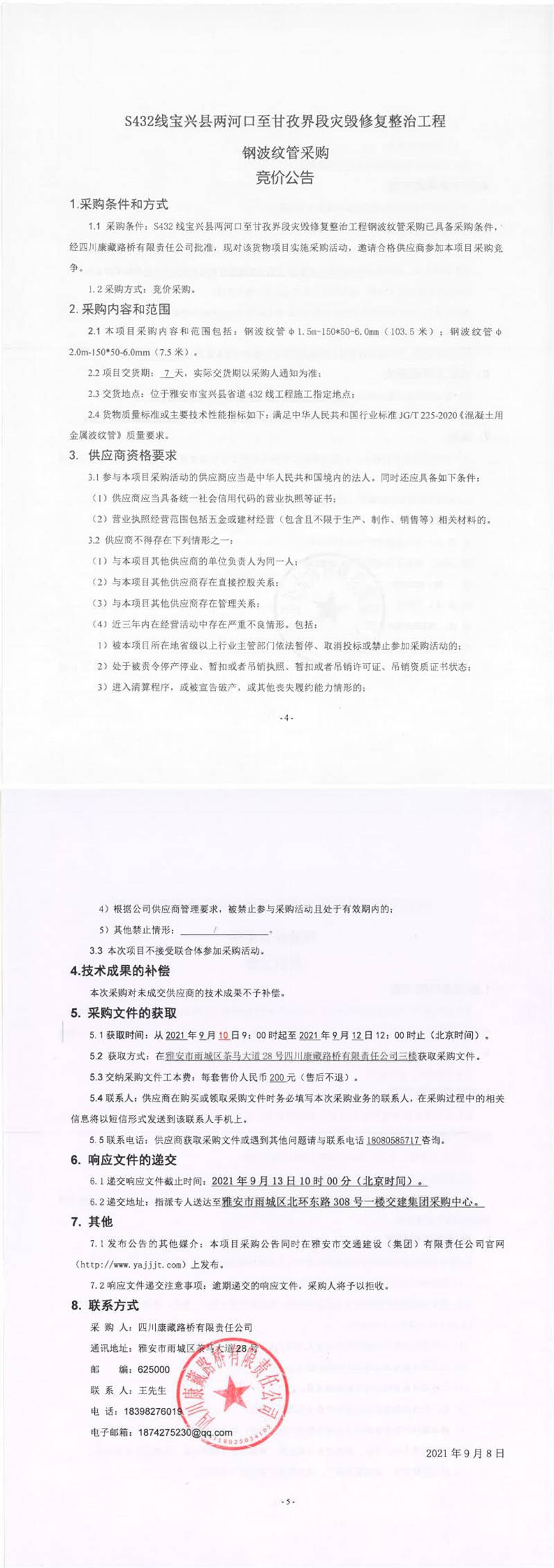 四川康藏路橋有限責任公司S432線寶興縣兩河口至甘孜界段災毀修復整治工程鋼波紋管采購競價公告