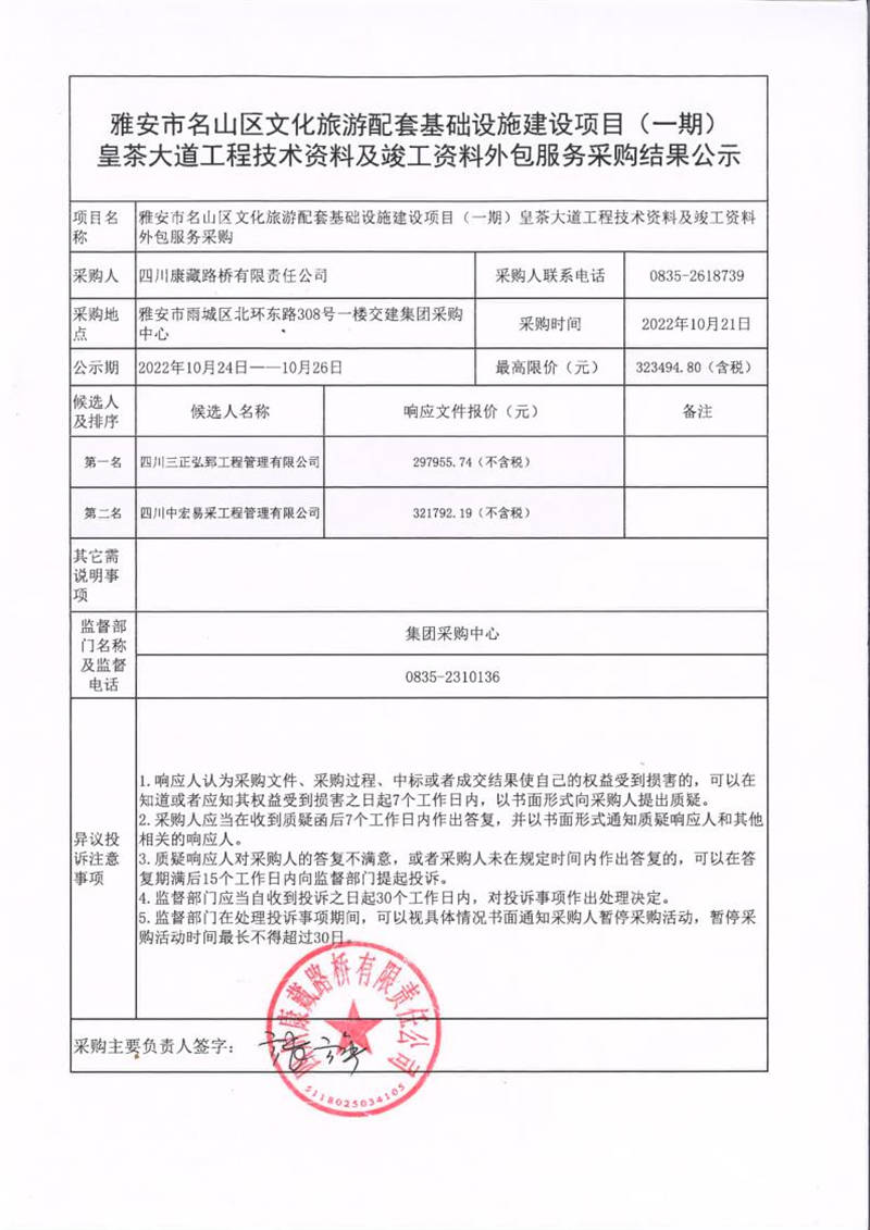 四川康藏路橋有限責任公司雅安市名山區(qū)文化旅游配套基礎(chǔ)設(shè)施建設(shè)項目(一期)皇茶大道工程技術(shù)資料及竣工資料外包服務采購結(jié)果公示