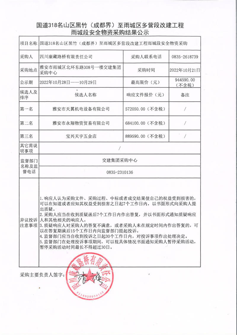 四川康藏路橋有限責(zé)任公司國道318名山區(qū)黑竹(成都界)至雨城區(qū)多營段改建工程雨城段安全物資采購結(jié)果公示