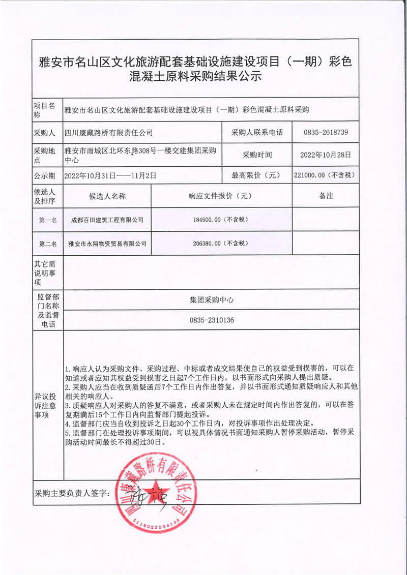 四川康藏路橋有限責任公司雅安市名山區(qū)文化旅游配套基礎設施建設項目(一期)彩色混凝土原料采購結果公示