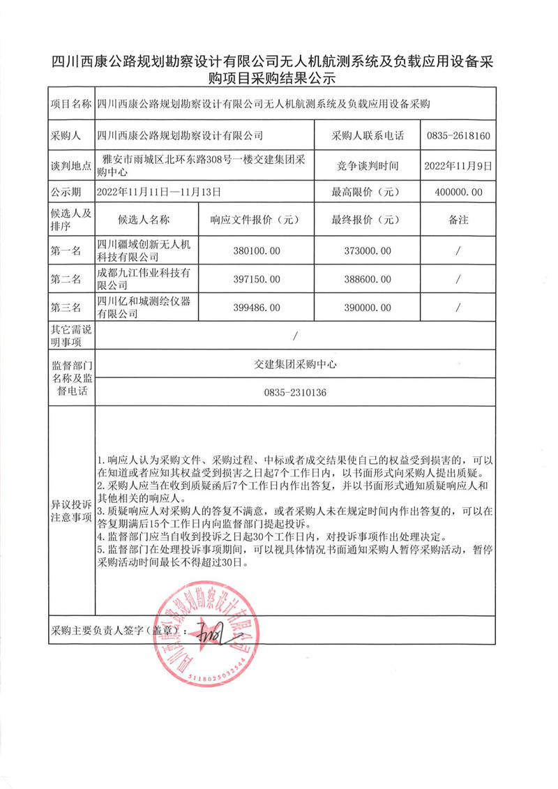 四川西康公路規(guī)劃勘察設(shè)計有限公司無人機(jī)航測系統(tǒng)及負(fù)載應(yīng)用設(shè)備采購項目采購結(jié)果公示
