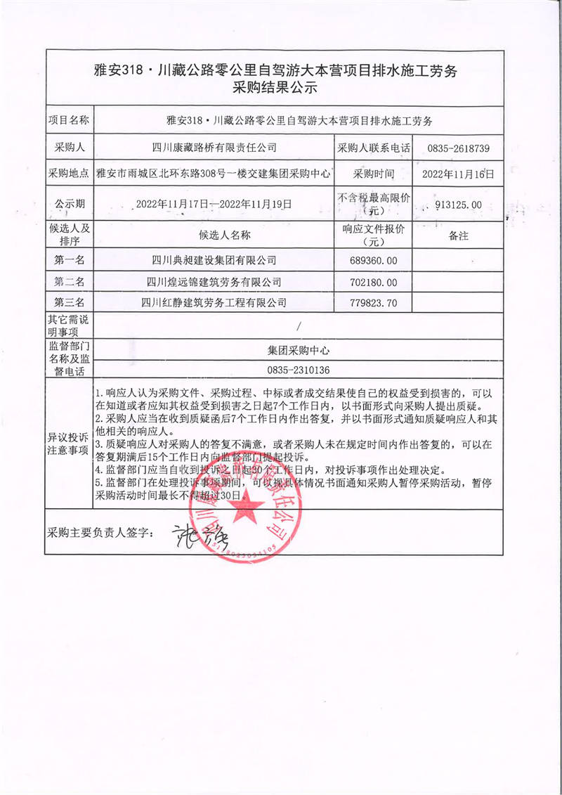 四川康藏路橋有限責(zé)任公司雅安318·川藏公路零公里自駕游大本營(yíng)項(xiàng)目排水施工勞務(wù)采購(gòu)結(jié)果公示