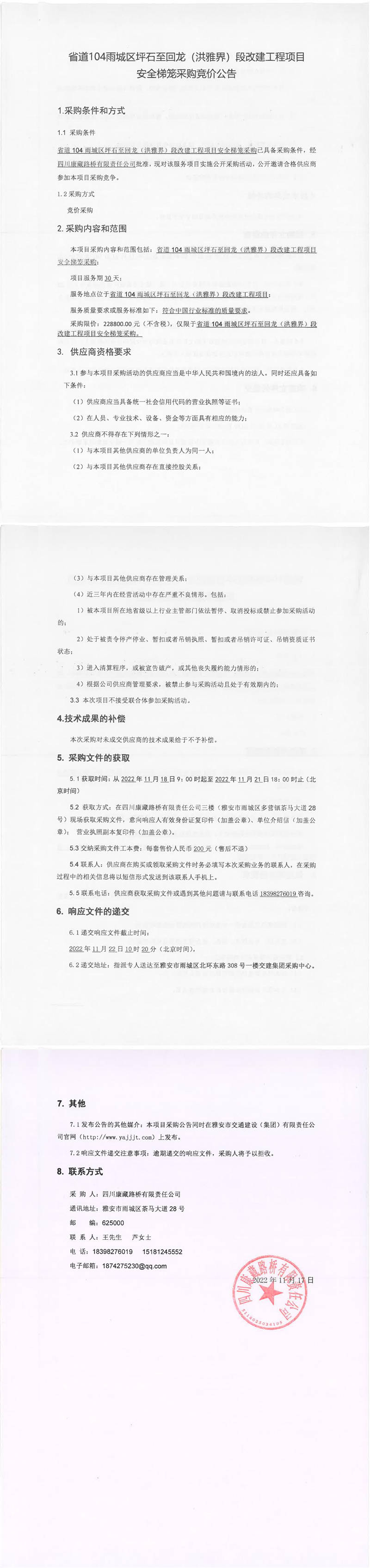 四川康藏路橋有限責(zé)任公司省道104雨城區(qū)坪石至回龍(洪雅界)段改建工程項目安全梯籠采購競價公告