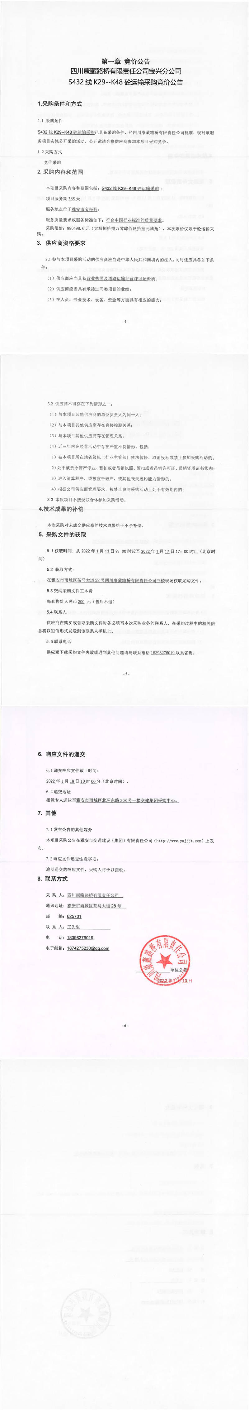 四川康藏路橋有限責(zé)任公司寶興分公司S432線K29-K48砼運(yùn)輸采購(gòu)競(jìng)價(jià)公告