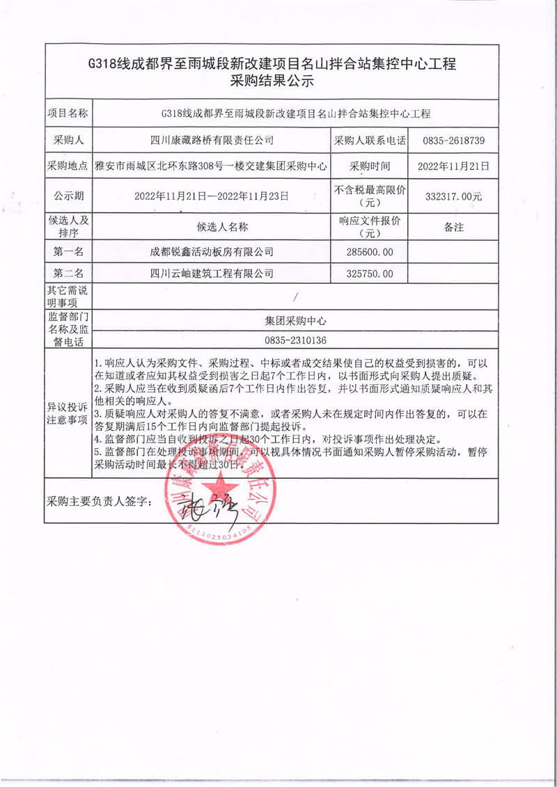 四川康藏路橋有限責(zé)任公司G318線成都界至雨城段新改建項(xiàng)目名山拌合站集控中心工程采購結(jié)果公示
