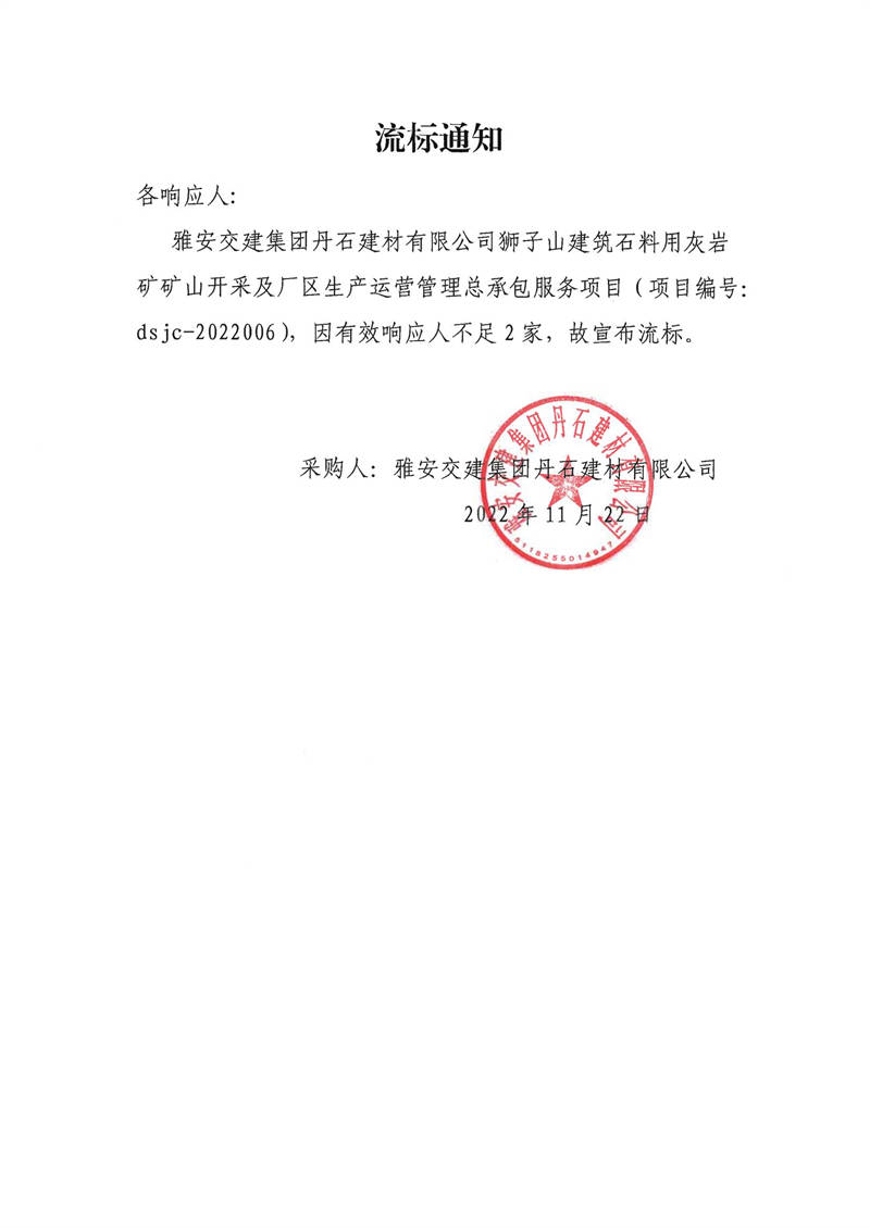 雅安交建集團丹石建材有限公司獅子山建筑石料用灰?guī)r礦礦山開采及廠區(qū)生產(chǎn)運營管理總承包服務(wù)項目采購流標通知
