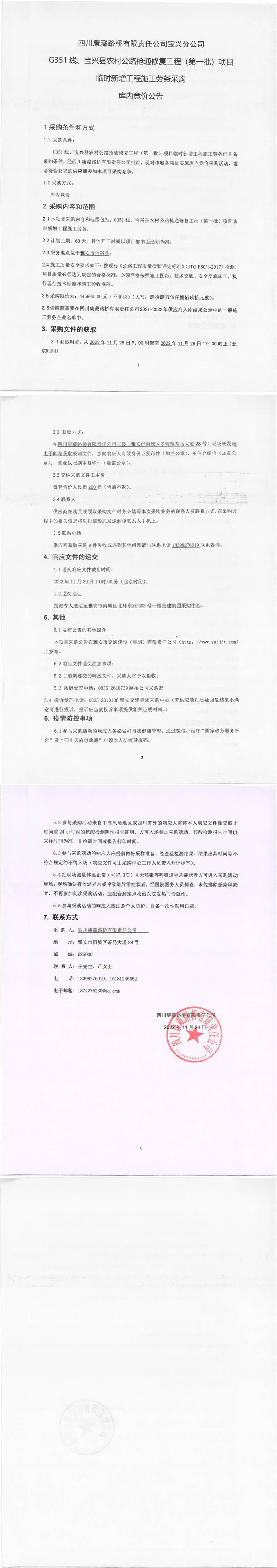 四川康藏路橋有限責任公司G351線、寶興縣農(nóng)村公路搶通修復工程(第一批)項目臨時新增工程施工勞務采購庫內競價公告