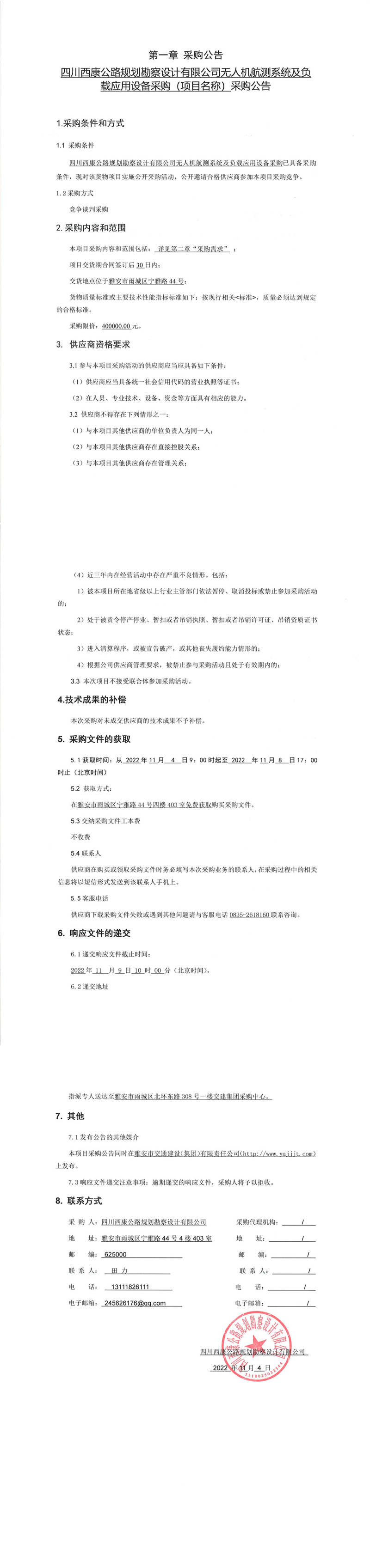 四川西康公路規(guī)劃勘察設計有限公司無人機航測系統及負載應用設備采購(項目名稱)采購公告