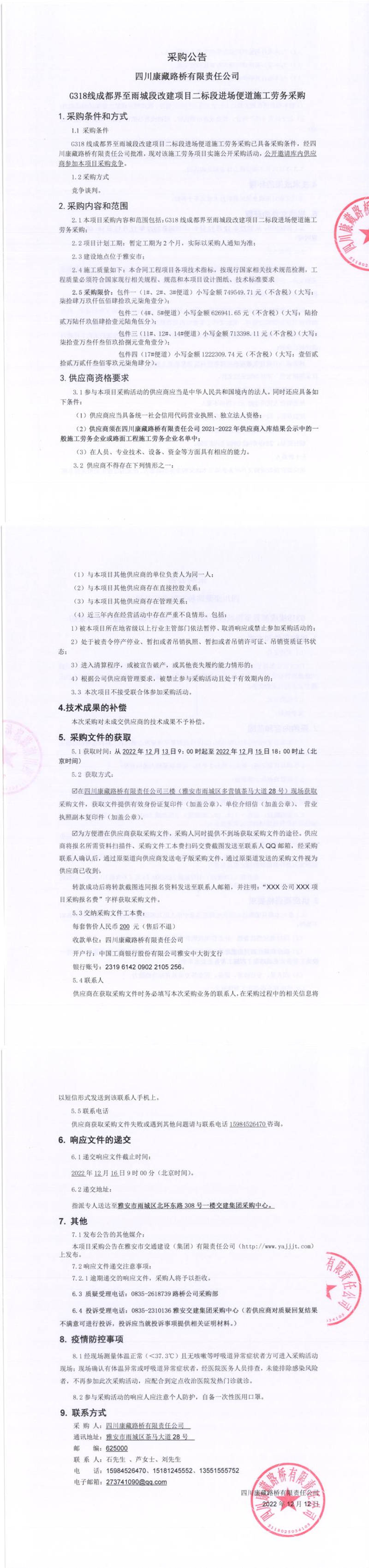 四川康藏路橋有限責(zé)任公司G318線成都界至雨城段新改建項目二標(biāo)段進場便道施工勞務(wù)采購公告