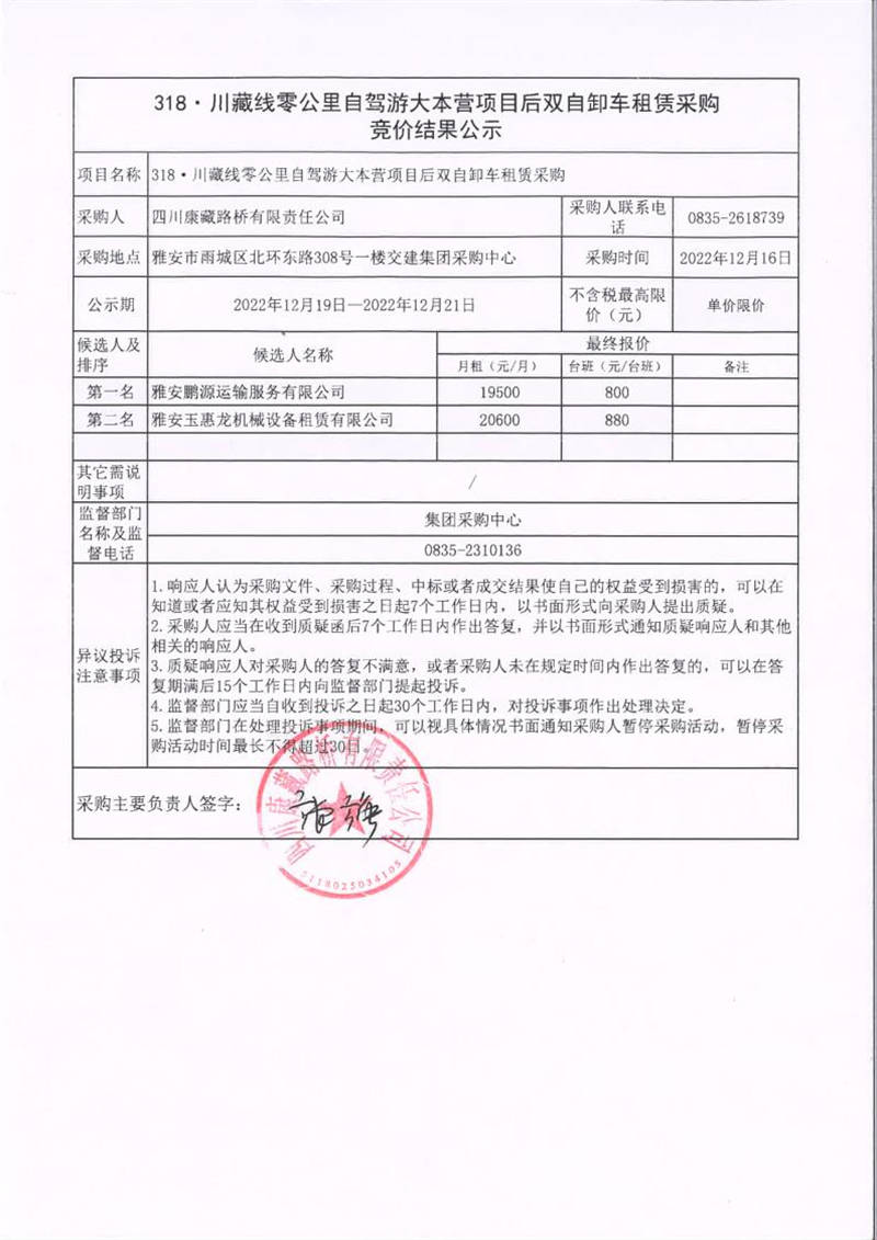 四川康藏路橋有限責(zé)任公司318·川藏線零公里自駕游大本營項(xiàng)目后雙自卸車租賃采購競價(jià)結(jié)果公示