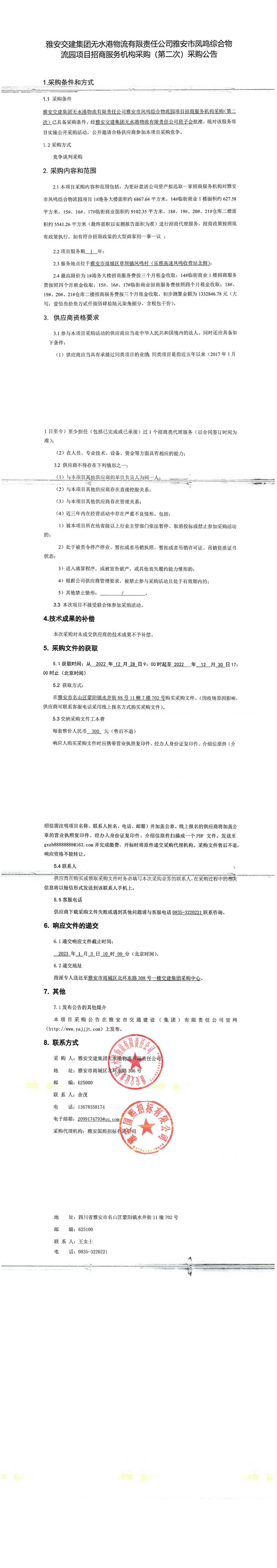 雅安交建集團無水港物流有限責任公司雅安市鳳鳴綜合物流園項目招商服務機構采購(第二次)采購公告