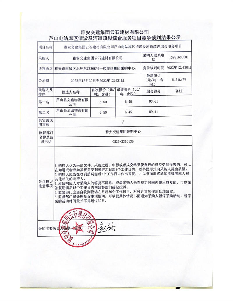 雅安交建集團云石建材有限公司蘆山電站庫區(qū)清淤及河道疏浚綜合服務(wù)項目競爭談判結(jié)果公示