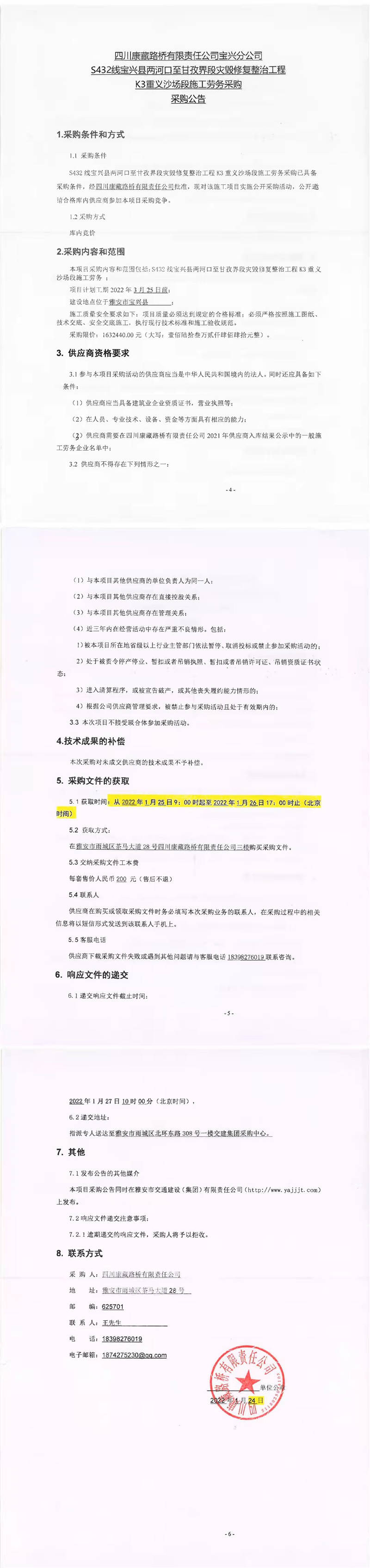 四川康藏路橋有限責(zé)任公司寶興分公司S432線寶興縣兩河口至甘孜界段災(zāi)毀修復(fù)整治工程K3重義沙場(chǎng)段施工勞務(wù)采購(gòu)采購(gòu)公告