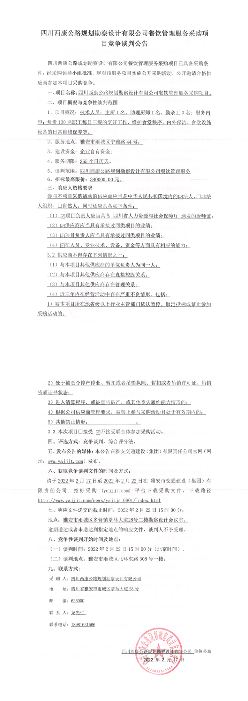 四川西康公路規(guī)劃勘察設(shè)計有限公司餐飲管理服務(wù)采購項目競爭談判公告