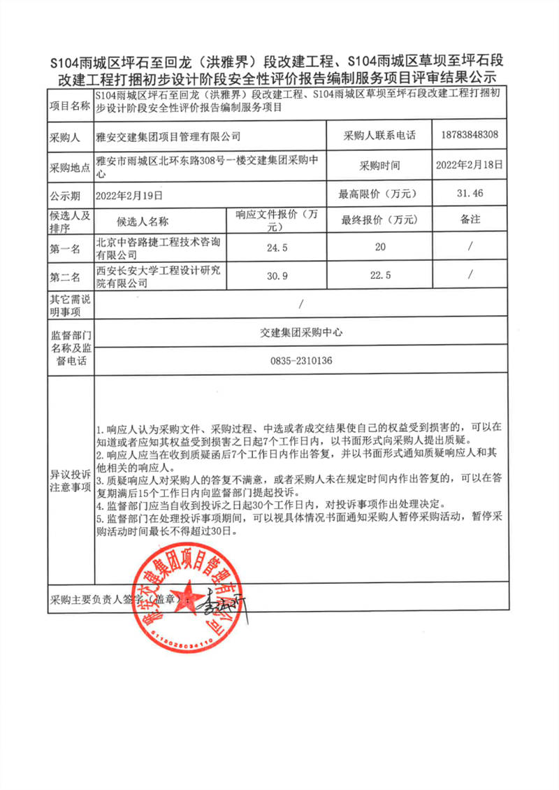 雅安交建集團(tuán)項(xiàng)目管理有限公司S104雨城區(qū)坪石至回龍(洪雅界)段改建工程、S104雨城區(qū)草壩至坪石段改建工程打捆初步設(shè)計階段安全性評價報告編制服務(wù)項(xiàng)目評審結(jié)果公示