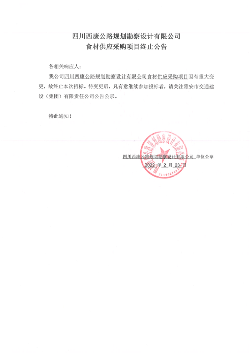 四川西康公路規(guī)劃勘察設(shè)計有限公司食材供應采購項目終止公告