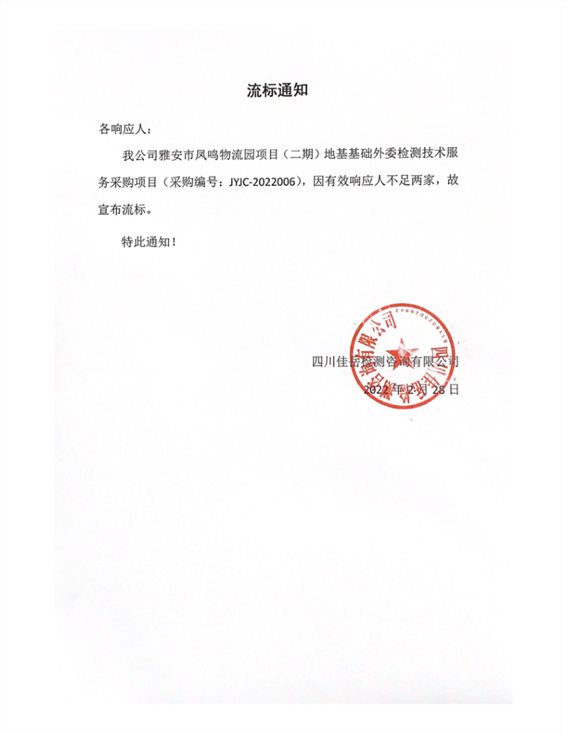 四川佳岳檢測咨詢有限公司雅安市鳳鳴物流園項目(二期)地基基礎(chǔ)外委檢測技術(shù)服務(wù)采購項目流標通知