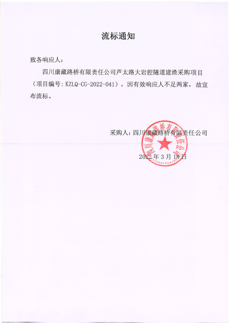 四川康藏路橋有限責(zé)任公司蘆太路大巖腔隧道建渣采購項(xiàng)目流標(biāo)通知