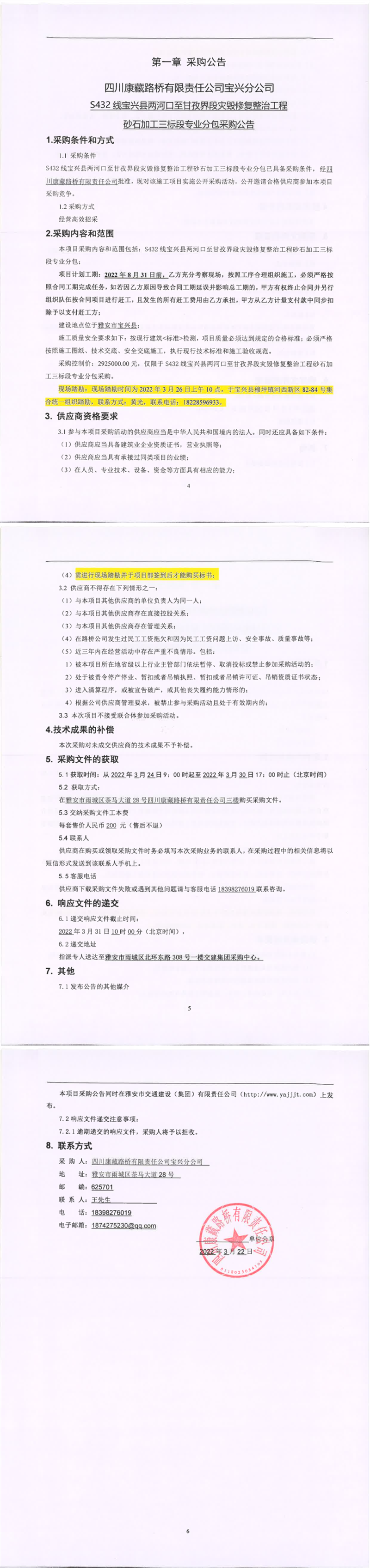 四川康藏路橋有限責(zé)任公司S432線寶興縣兩河口至甘孜界段災(zāi)毀修復(fù)整治工程砂石加工三標(biāo)段專業(yè)分包采購公告